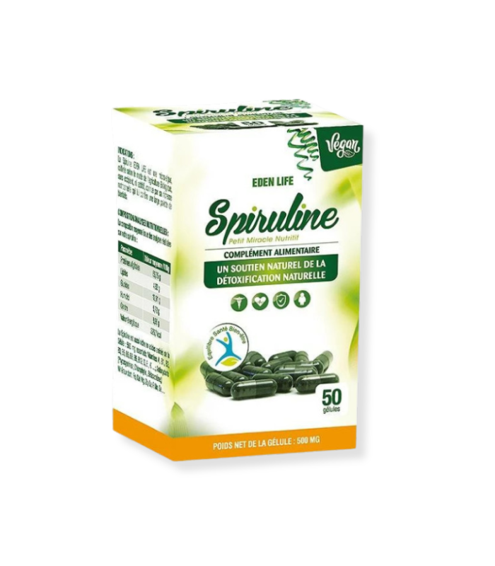 Eden Life Spiruline Gélules est une spiruline biologique tunisienne, riche en protéines (66 %), vitamines, minéraux et antioxydants. Elle soutient l’énergie, l’immunité et la récupération physique au quotidien.